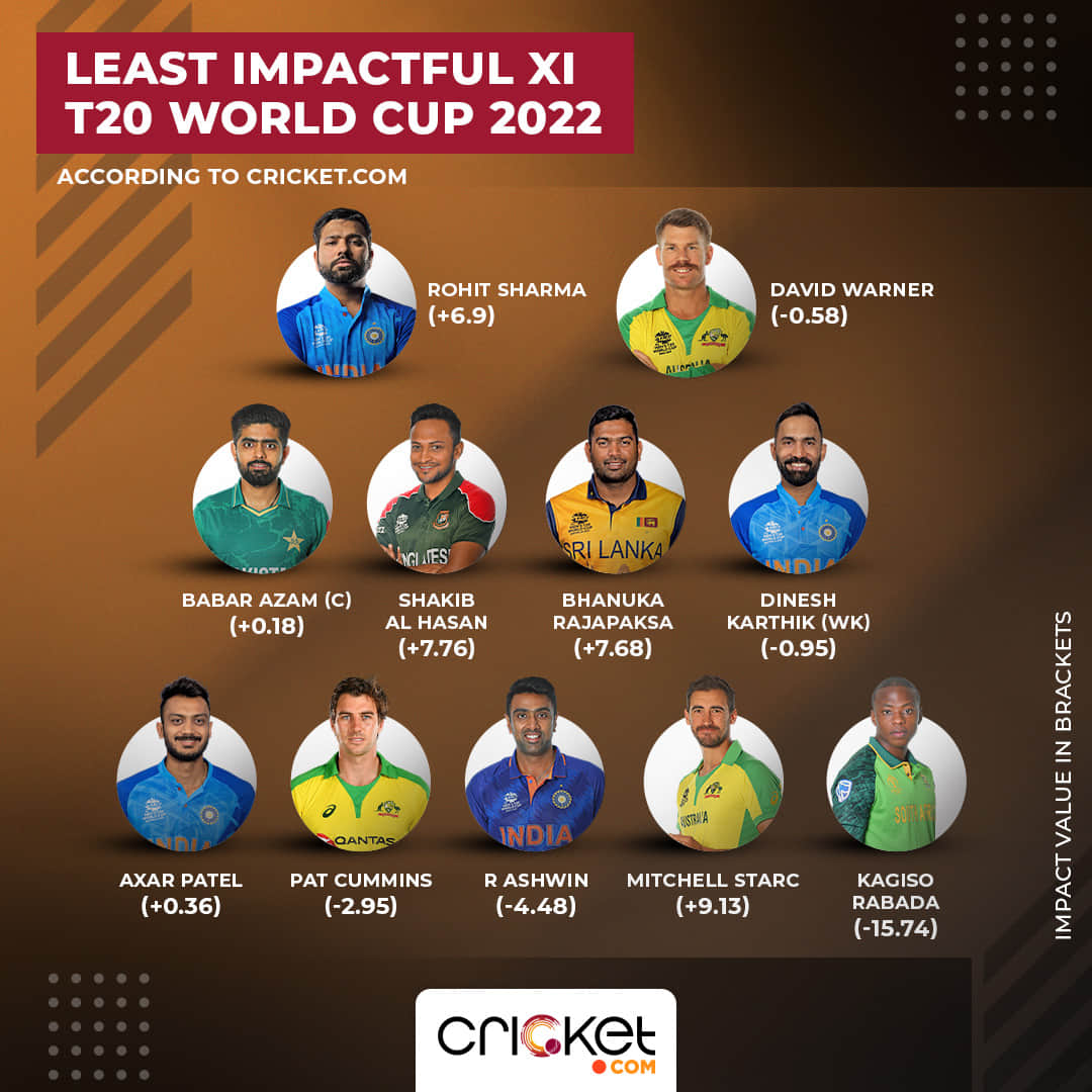 It was a strange World Cup. Alongside numerous upsets, we saw many star players fail miserably. It had a direct impact on the fortunes of their team. Here is Cricket.com’s least impactful XI of the T20 World Cup 2022, based on impact reading deduced from Criclytics, our AI-powered prediction engine.