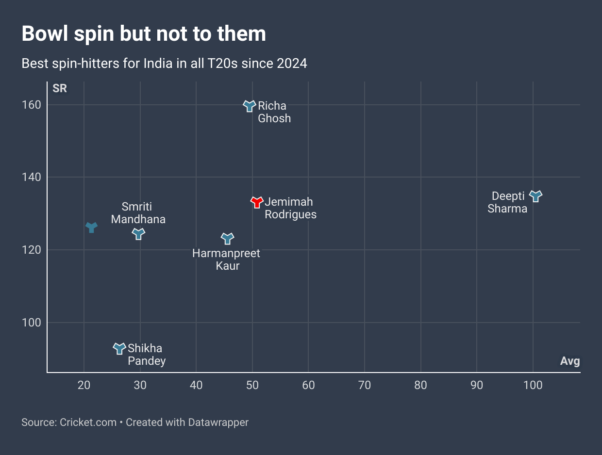With the upcoming T20 World Cup in the Middle East, Jemimah has shown her captain that she has all the tools to be the numero-uno against spin. Now, with the newfound range, maybe she could just be the No.5 that India need.