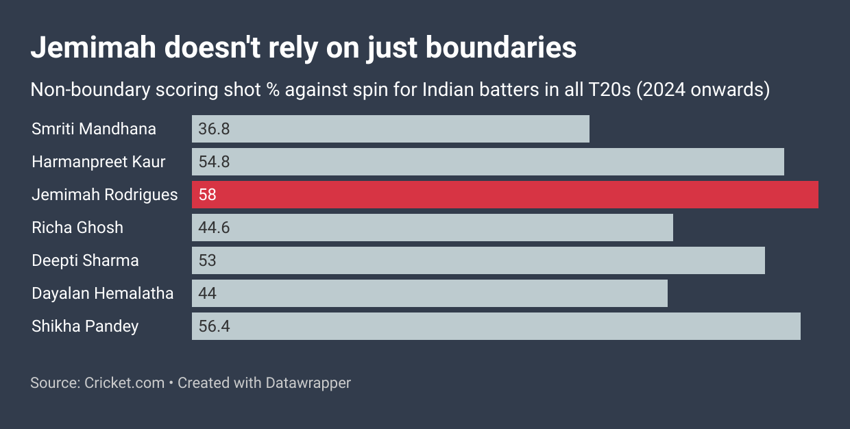 A combination of factors allows Jemimah to flourish in one of the most challenging spots, including her ability to play spin, manoeuvre the gaps effectively, and rotate the strike so that one batter doesn’t get stuck in one place far too often.