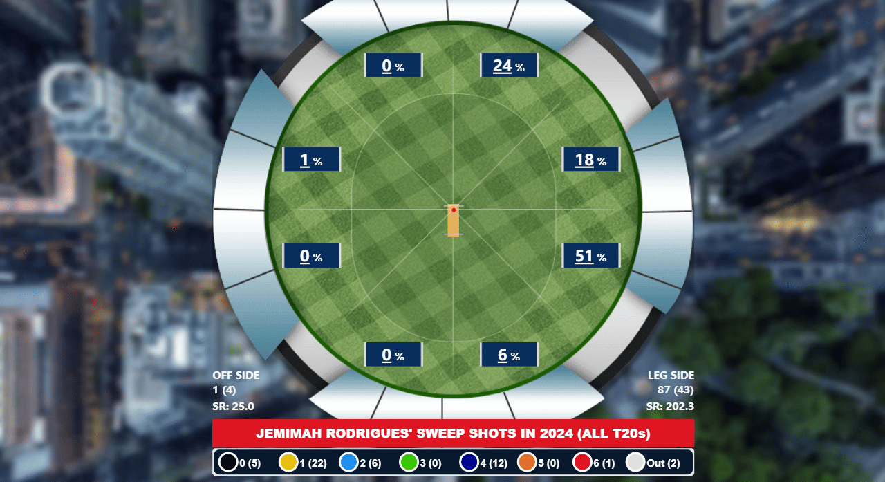 In 2024, nearly 24% of Jemimah’s all runs have come off some variety of sweep - slog, sweep or the paddle. It is so effective that she struck at 300 while playing the slog sweep, 168.3 while playing the conventional one and struck at 200 while paddling them fine.
