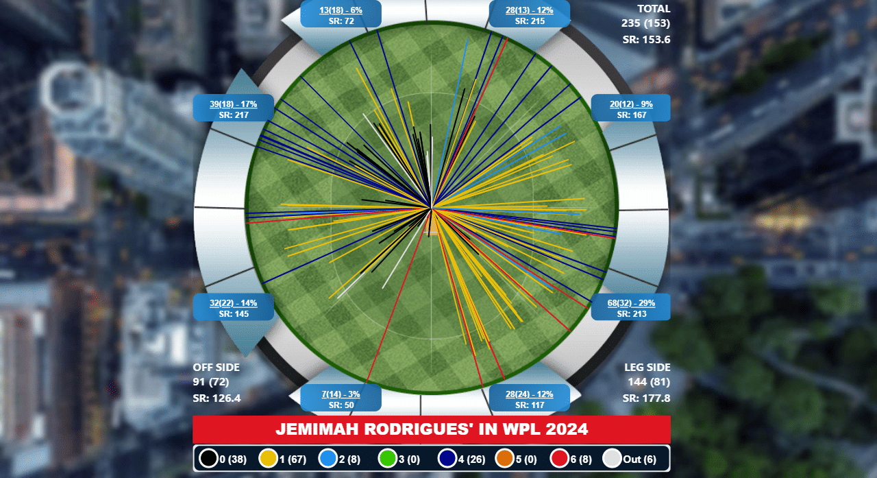 Throughout the 2024 WPL, Jemimah made it a thing to either use the sweep or the paddle sweep against spinners or use the fine-leg region against the pacers by scrambling around at the crease. In one of the clashes against Mumbai Indians during the season, she even stunned Nat Sciver-Brunt with a six in the fine-leg region with a brilliantly played swipe.