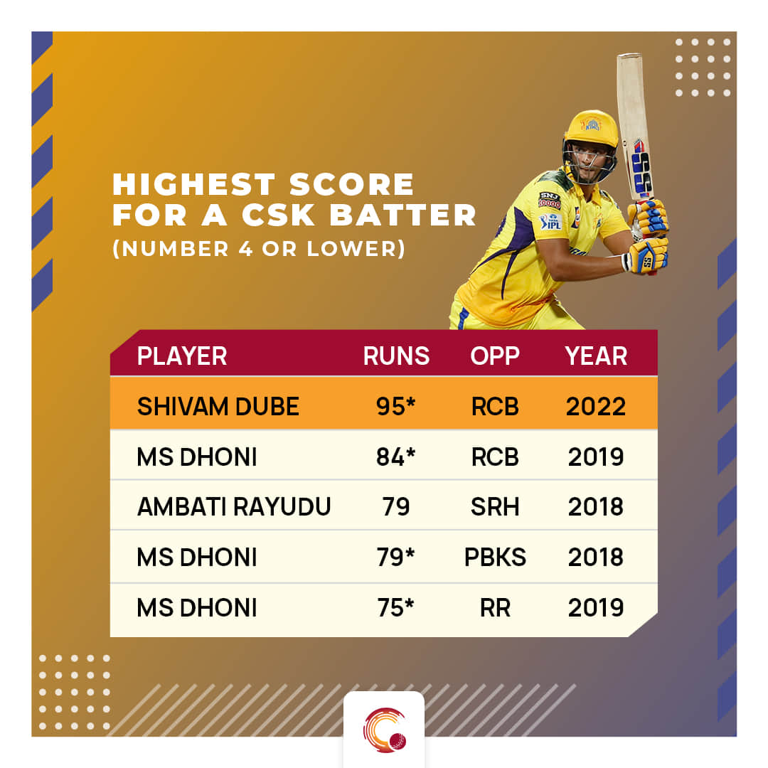 By smashing an unbeaten 95, Dube registered his highest score in T20s, surpassing his 64 against Chennai in 2021 while playing for Rajasthan Royals. To add more to his glory, his score of 95 was also the best score by a Chennai number 4 or lower batsman in the IPL. In this edition, he is just 11 runs behind Jos Buttler (218) in the race to Orange Cap.