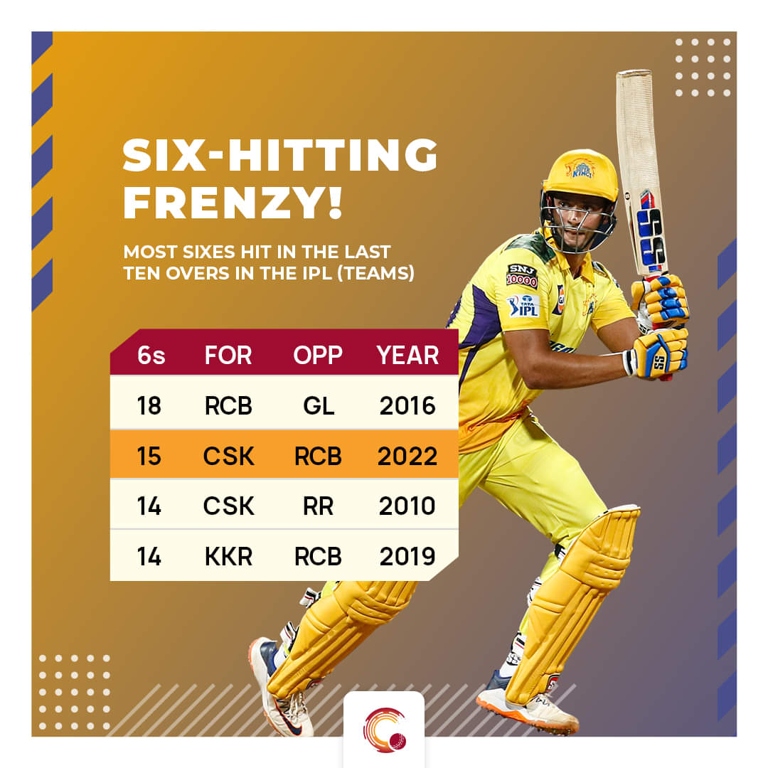 In the last 10 overs, Chennai batsmen clubbed 15 sixes, which is the second most sixes hit by a team in the second half of the innings in an IPL match. All the 17 sixes in this innings came off the bat of Uthappa (9) and Dube (8).