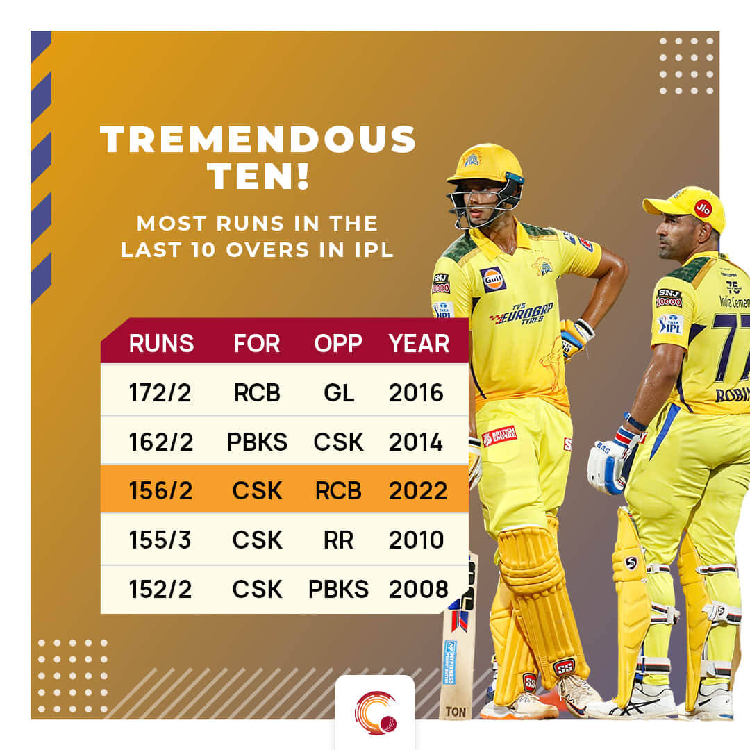In the last 10 overs, Chennai smashed 156 runs and helped their team to post 216 at the end of 20th over. The 156 runs scored by Chennai in the second half is the third most runs scored by a team in the IPL. In the last five overs, Chennai scored 83 runs. Only against Sunrisers Hyderabad in 2013, they had hit more runs in the last five overs (87/0).