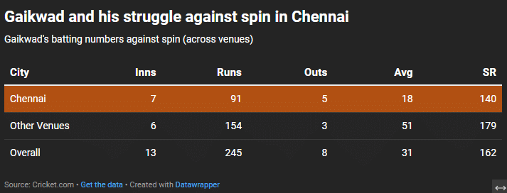 What works in his favour is that Gaikwad has scored 283 runs at the venue, averaging a high 31.4 and a strike rate of 136. The biggest thing that Gaikwad would have to brave at the venue is Gujarat’s spin unit.