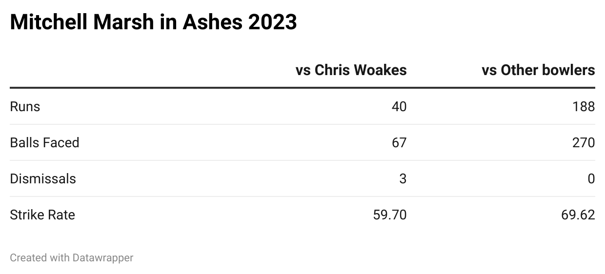 4 innings into this Ashes, Mitch Marsh has obliterated the England bowlers, smashing 228 runs at an average of 76.00 and SR of 67.7. Well, he’s obliterated all but one bowler: Chris Woakes.