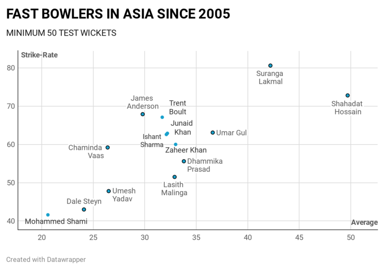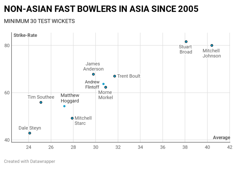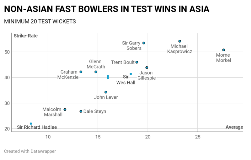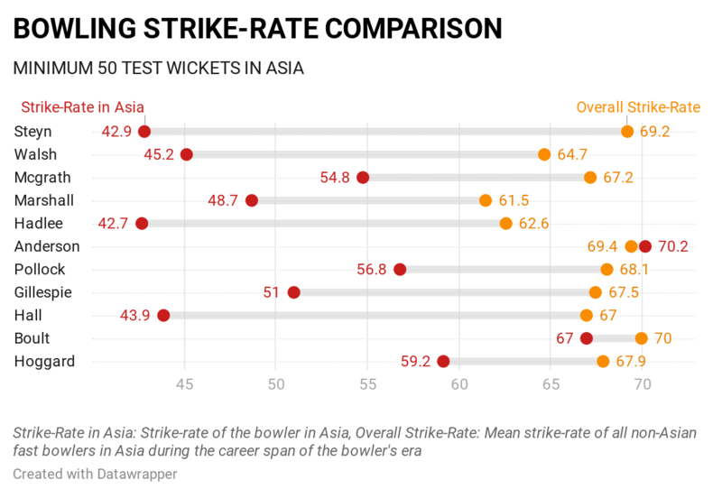 Comparing him with the most productive non-Asian pacers of all generations, Steyn again stands out. Amongst all non-Asian pacers with a minimum of 50 Test wickets in Asia, he is only behind Sir Richard Hadlee in terms of strike-rate. However, when the numbers of the specific eras corresponding to the career span of individuals are put into account, Steyn is unmatchable.