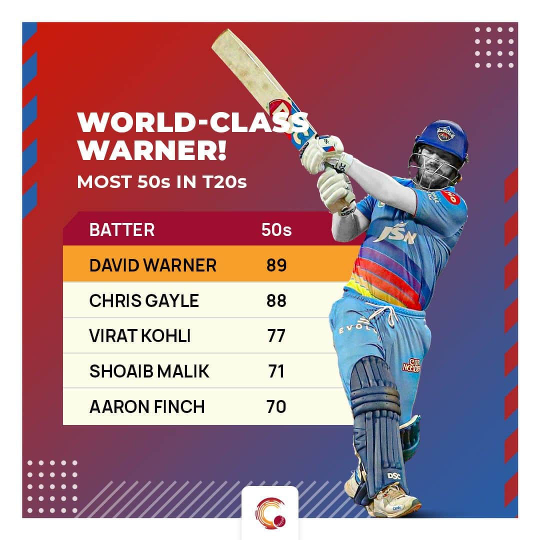 En route to this destructive innings, Warner recorded the most fifties by a batter in T20s surpassing Chris Gayle, who has 88 half-centuries.