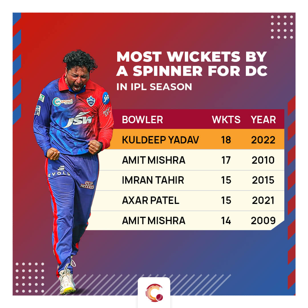 With the wicket of Karthik Tyagi on the first ball of the final over, Kuldeep took his tally to 18 wickets in the season, which is the most by a Capitals spinner in a single season of the IPL, surpassing the previous best of 17 wickets by Amit Mishra in 2010 season.