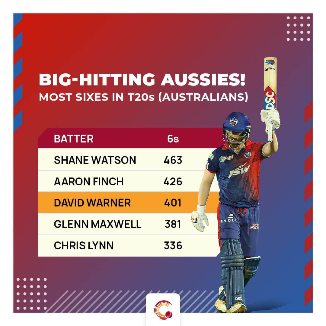 The three sixes in the innings powered Warner to become only the third Australian batter to smash 400 sixes in the T20s. While he has 401 maximums to his name, Shane Warne leads the table with 463, followed by Aaron Finch with 426 sixes.