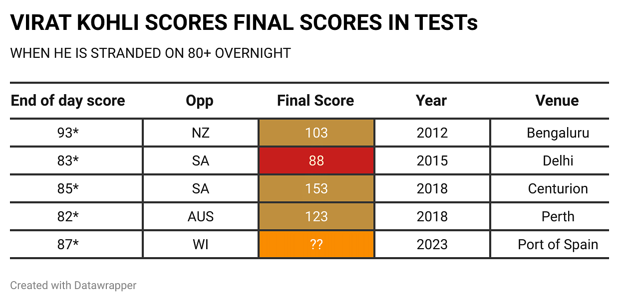 Adding to that, West Indies are yet to take the new ball, and Kohli needs to add 13 runs to his overnight score. In Tests, this is the fifth innings in which Kohli is stranded on an 80+ score at the end of the day's play. In the previous four occasions, he had converted three into a century. Well, that is a positive sign.