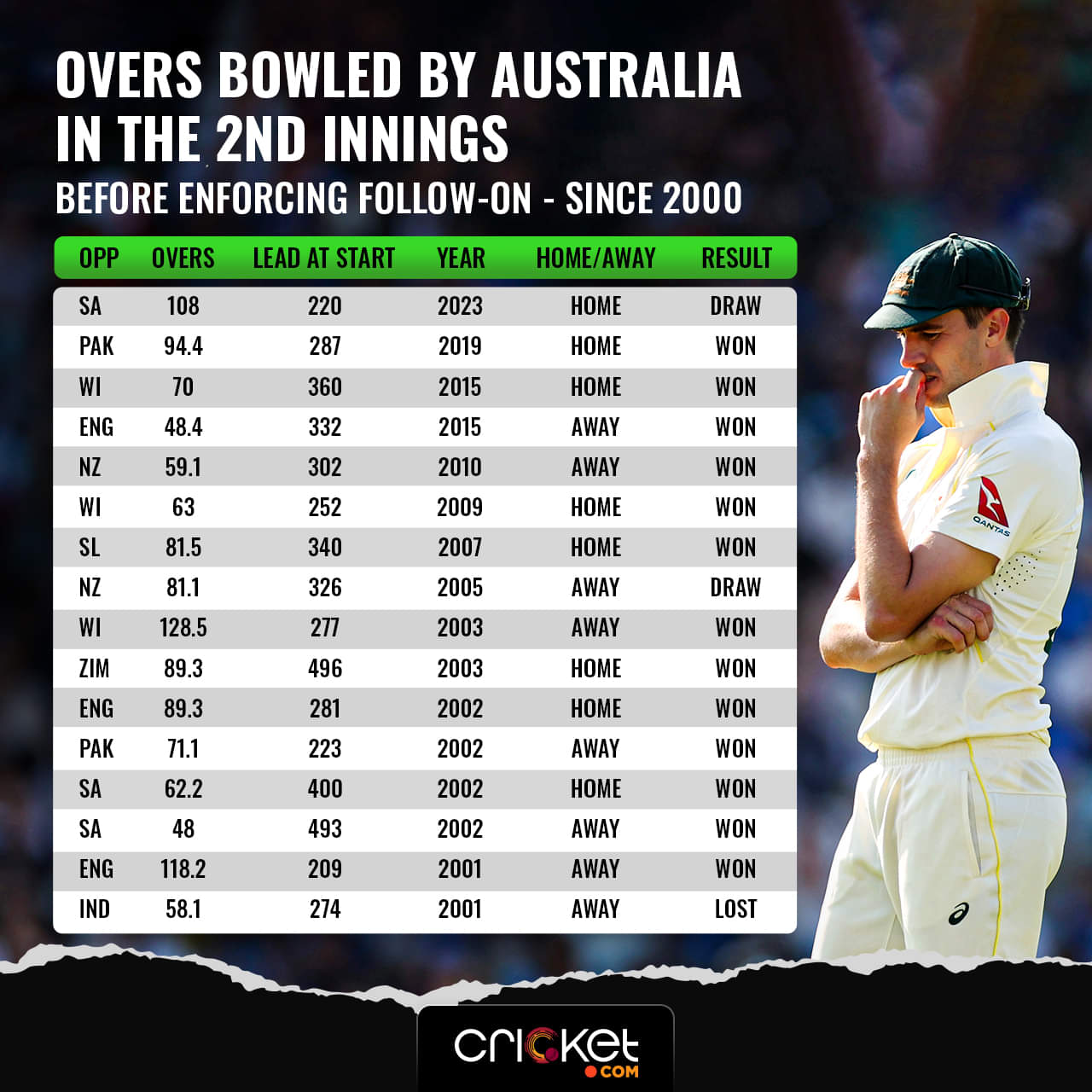 In 16 matches where they have enforced the follow-on, Australia have bowled 100+ overs thrice, winning two and drawing one. The draw was against South Africa in 2023 (owing to rain). In five other games, they have bowled 80+ overs.