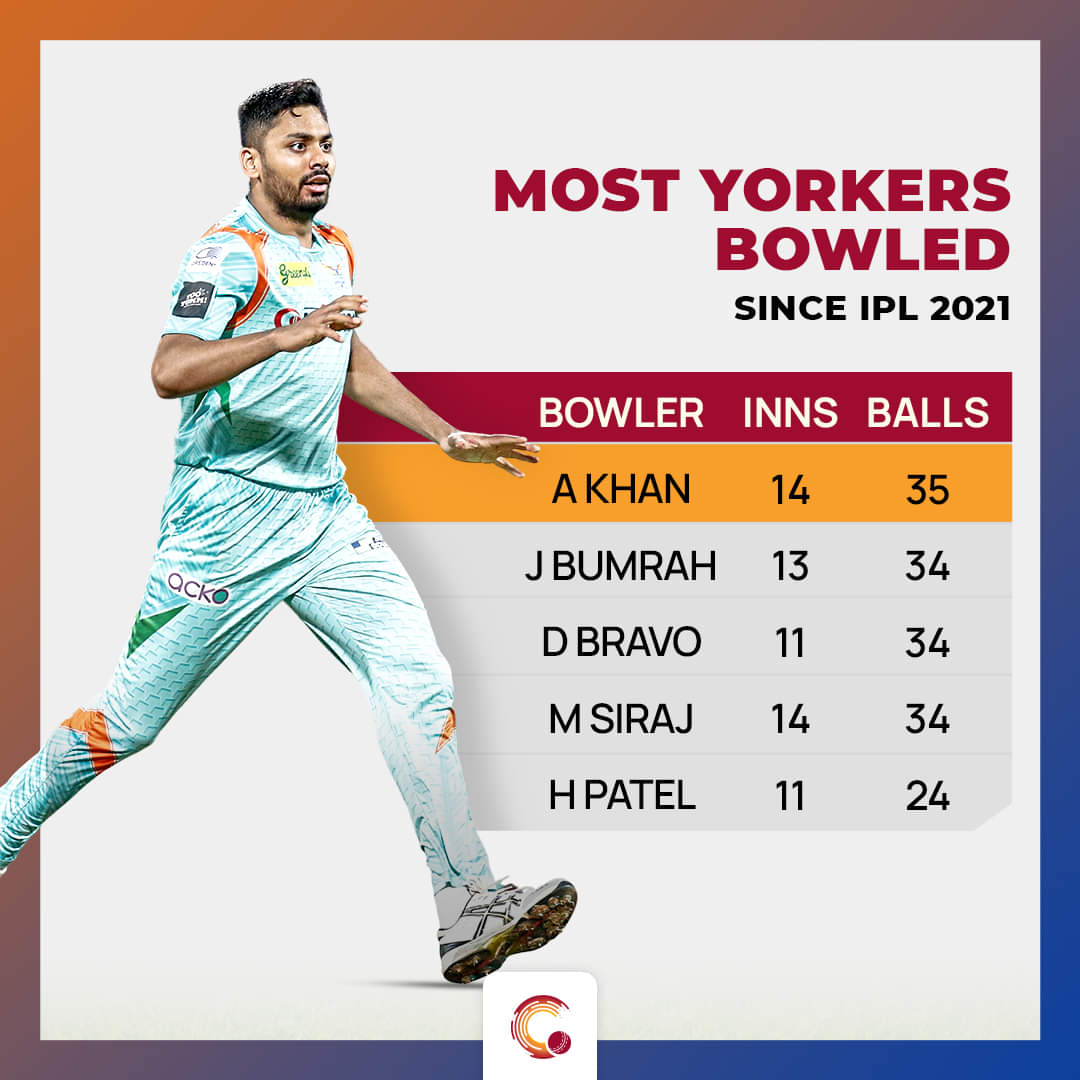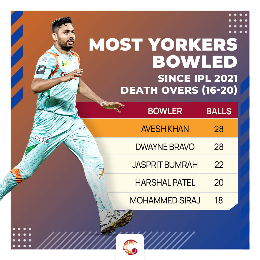 He is especially suited for the death, where his 16 wickets from 19 innings are only behind Harshal Patel (21) and has done so at an impressive economy rate of nine. His success could boil down to the fact that he has bowled the most yorkers in IPL since the last season.