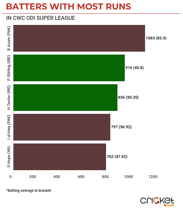 However, they snapped their 11-match losing streak across formats with a win over Afghanistan in Belfast recently. In the last year or so, Harry Tector has been a backbone for them with the bat. In fact, in the ODI Super League, only Paul Stirling (916) and Babar Azam (1,083) have more runs than Tector (856). He has two tons and seven fifties from 21 innings.