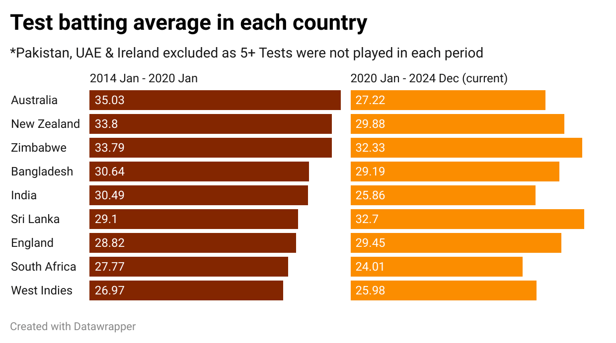 Between January 1, 2014 and January 8, 2020 (post the Sydney Test against New Zealand), the batting average in Australia was a whopping 35.03, the highest among all countries during the said period.