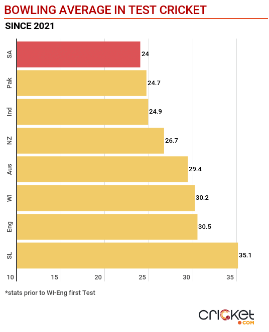 Despite many unexpected retirements, the quality of fast bowling hasn’t dropped with the arrivals of Marco Jansen, Anrich Nortje alongside Kagiso Rabada, Lungi Ngidi and the return of Duanne Olivier. Yes, they bowl mostly in the bowling-friendly conditions of South Africa but the average of 24 runs per wicket is the best in Test cricket since 2021.