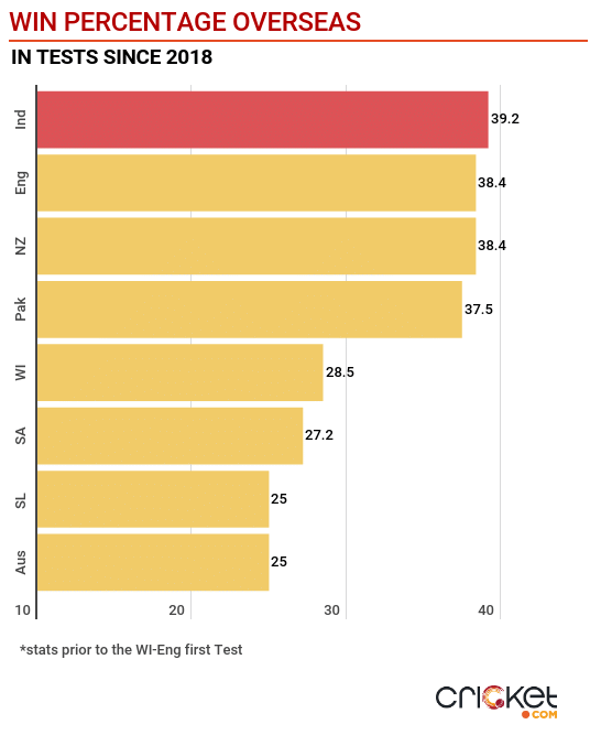 They have achieved these wins at the back of an impeccable bowling attack. India were always tough to beat at home owing to their spinners. Ravichandran Ashwin and Ravindra Jadeja have continued the same with the welcome addition of Axar Patel. Assembling their best pace attack to date - Jasprit Bumrah, Mohammad Shami, Mohammad Siraj to name a few - they are winning away as well. Since 2018, they have a win percentage of nearly 39.2 percent overseas, the best amongst all sides.