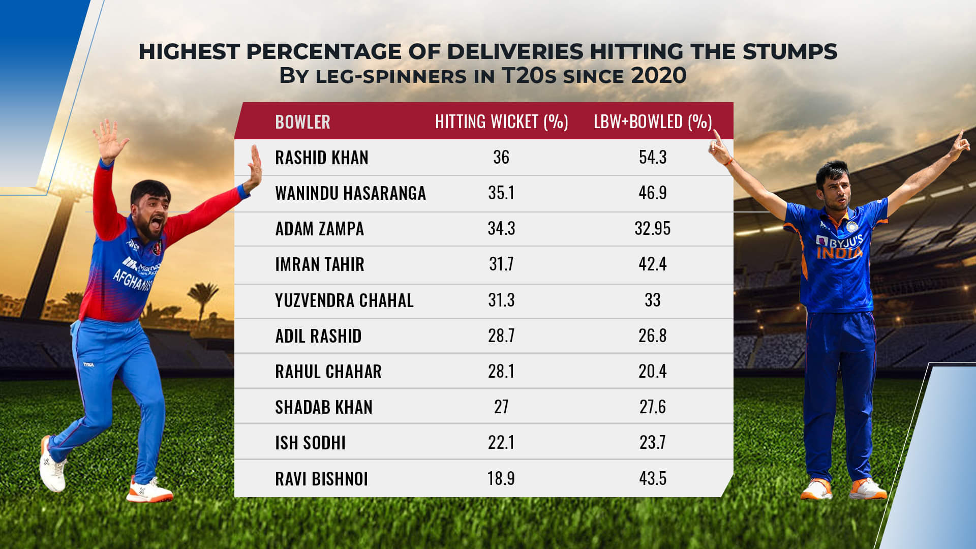 Trivia: Rashid and Bishnoi also have similar bowling strike-rates with their googlies - 15.8 and 15.6 balls per wicket respectively. Wanindu Hasarnga has the most effective googlies - 10.2 balls per wicket - followed by Imran Tahir at 11.3.