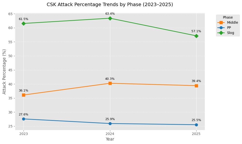 In 2025, CSK have the lowest attacking shot percentage in the PP at 25.5 percent. While this may partially reflect a lack of intent, it also highlights technical limitations, particularly against pace.