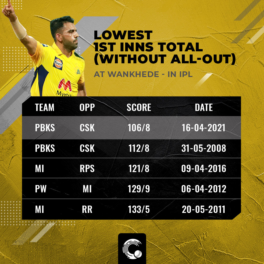 STATS HIGHLIGHTSBatting has proved to be difficult at the Wankhede in back-to-back games now. In yesterday’s match, Delhi Capitals could score only 147 and in reply, Rajasthan Royals managed to chase that with just two balls remaining. In tonight’s game, Punjab Kings displayed a worse performance as they could score only 106 in the first innings after batting full 20 overs. Chennai in reply chased it down in 16 overs to attain their first win of the season.