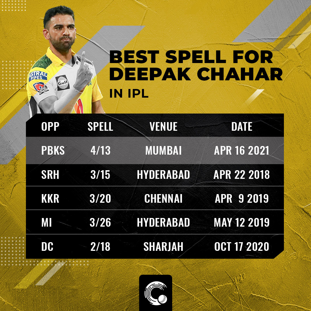 Heading into this match, Deepak Chahar who had been a lethal weapon with the ball in the first six overs for Chennai off late, was nearly fighting for his place in the XI. In the previous five IPL innings, Chahar didn’t have a single wicket in this phase. But tonight, he started off with a beauty to get rid of Mayank Agarwal. Later on, in his third over, he bagged the prized wickets of Chris Gayle and Nicholas Pooran in a span of three deliveries. In his last over, through the dismissal of Deepak Hooda, Chahar registered his first four-wicket haul in IPL. The last pacer to bag a four-wicket haul for Chennai in IPL was Lungisani Ngidi in 2018 against the same opponents.