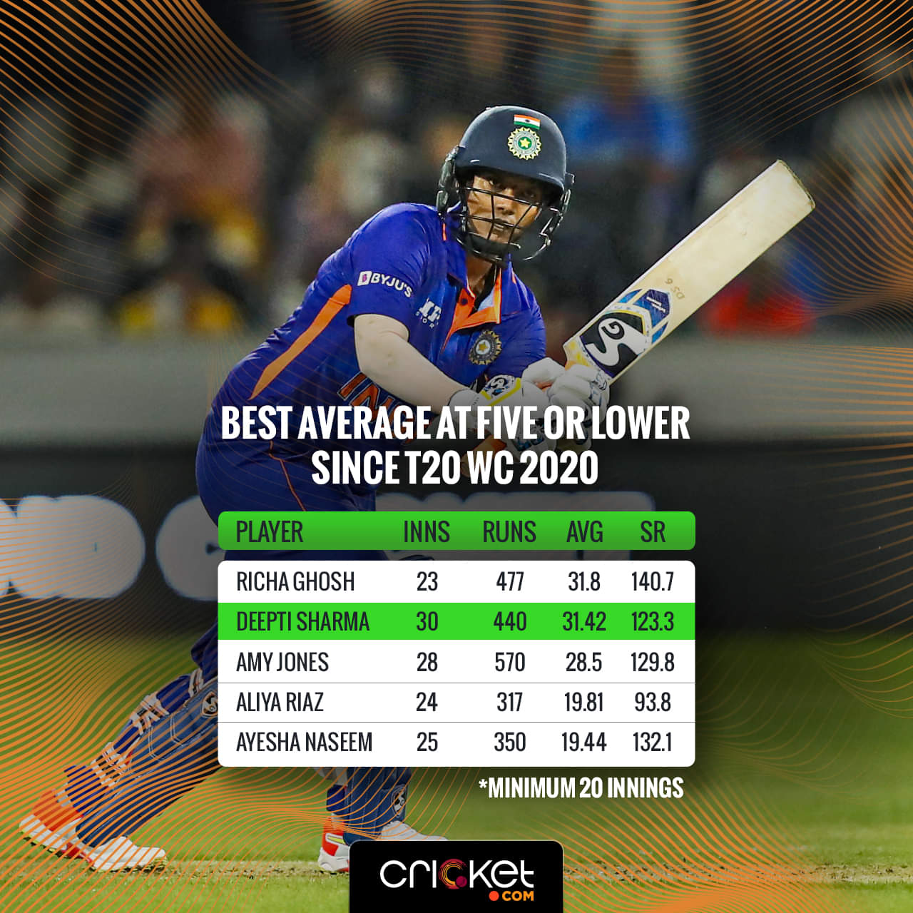 Since making her T20I debut against Australia in 2016, Deepti has batted at all the positions from number three to 11. There isn't any doubt that the left-hander has succeeded in the middle order as it allows her to rotate the strike and capitalise on the bad deliveries.
