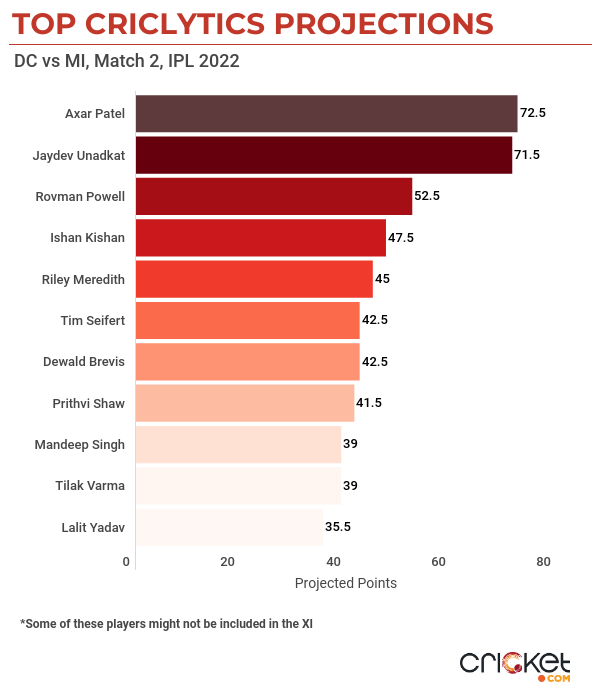 Our Criclytics Player Projector predicts Axar to score 72.5 points in this match