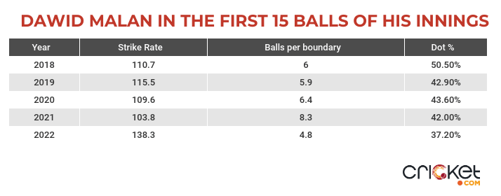 These two are succeeded by Malan, who is now a transformed batter. The two biggest criticisms against Malan last year were his tendency to start slow and his inability to score quickly versus spin, but he’s fixed both deficiencies. This year, Malan’s been striking at 138.3 in his first 15 balls and has maintained a SR of 141.32 against spinners. Subtract these two shortcomings and add the fact of him being a world-class batter versus pace, and what you get is what we saw in the series against Australia, where Malan struck 105 off 69 balls across two matches.