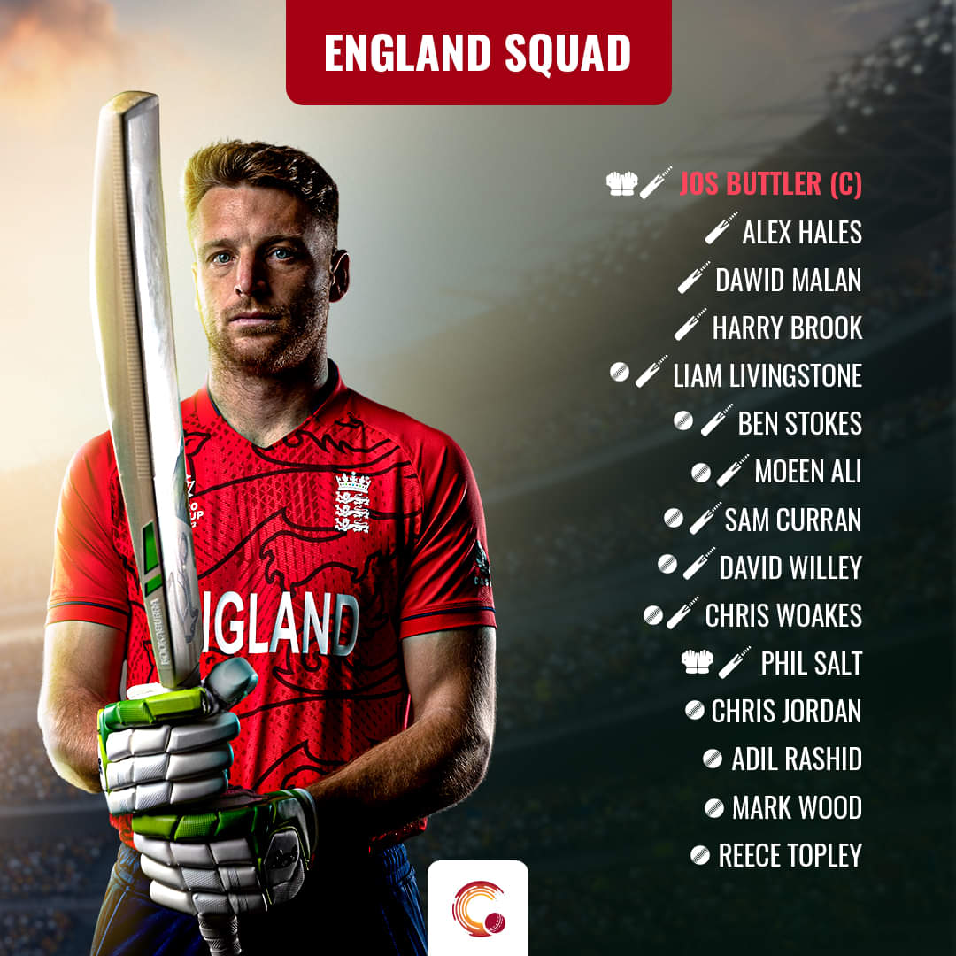 Jos Buttler ©, Alex Hales, Dawid Malan, Liam Livingstone, Ben Stokes, Harry Brook, Moeen Ali, Sam Curran, Adil Rashid, Chris Woakes, Mark Wood