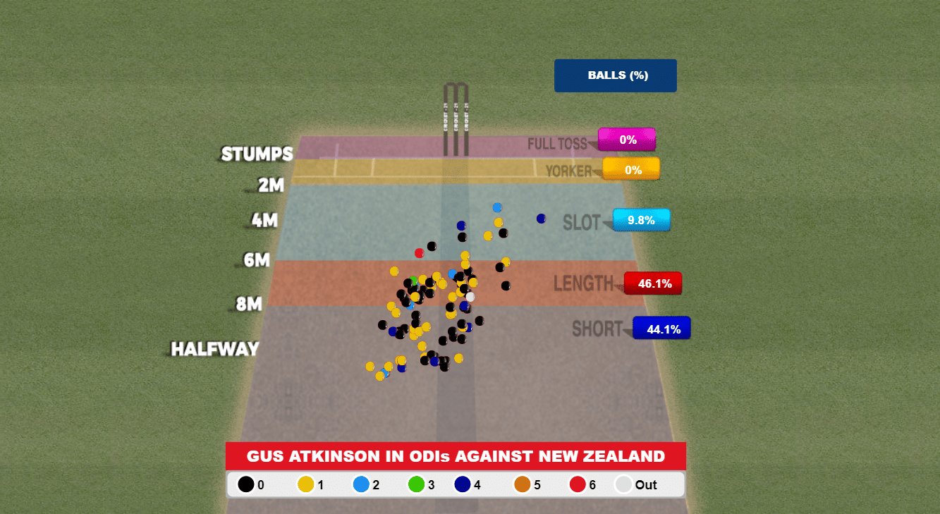 That has clearly worked as he went on to make his international debut for England in the first T20I against New Zealand at Old Trafford, where he picked up four wickets. His pace, accuracy, bowling those hard lengths, and more often than not, hurrying the batters - these are some of the things Atkinson brings to the table. Moreover, he does not shy away from bowling at the stumps, accounting for nearly 37% of such deliveries in the 50-over format for England so far.