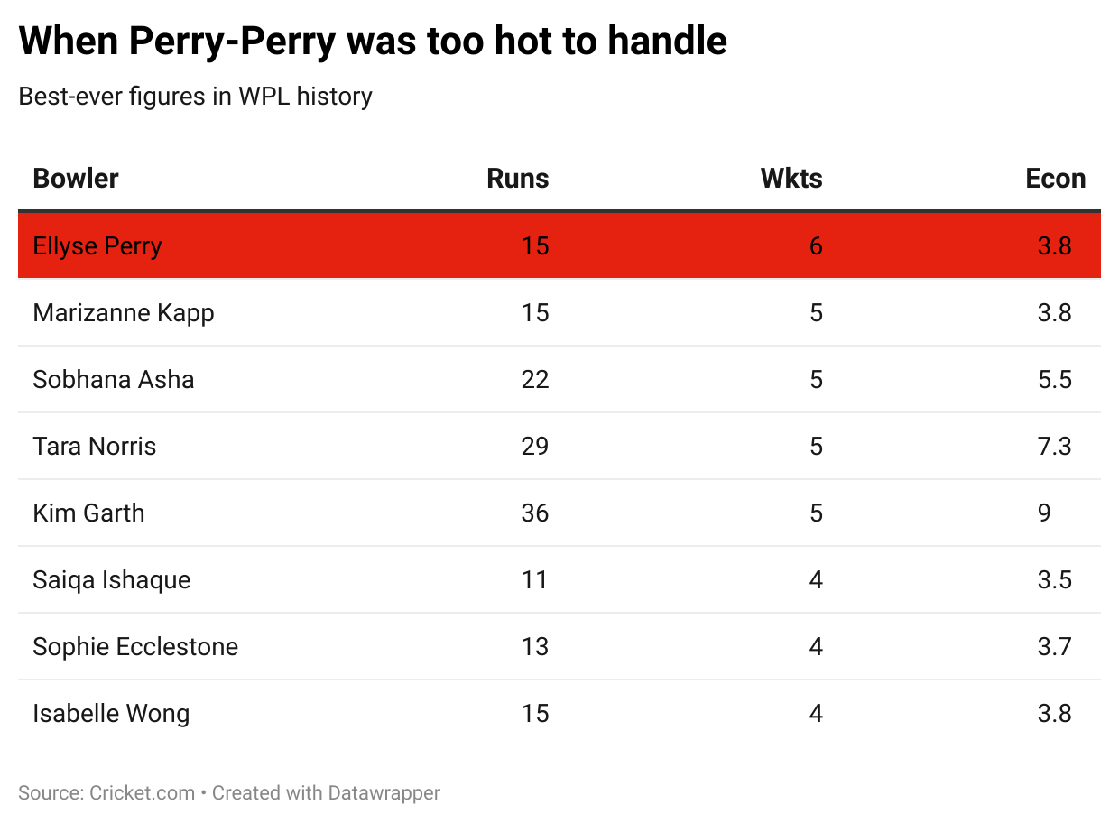 So she does the most Perry thing of all time, picking up a sixth wicket. Never before in the history of the WPL has anyone picked up six, forget in a near knock-out game.