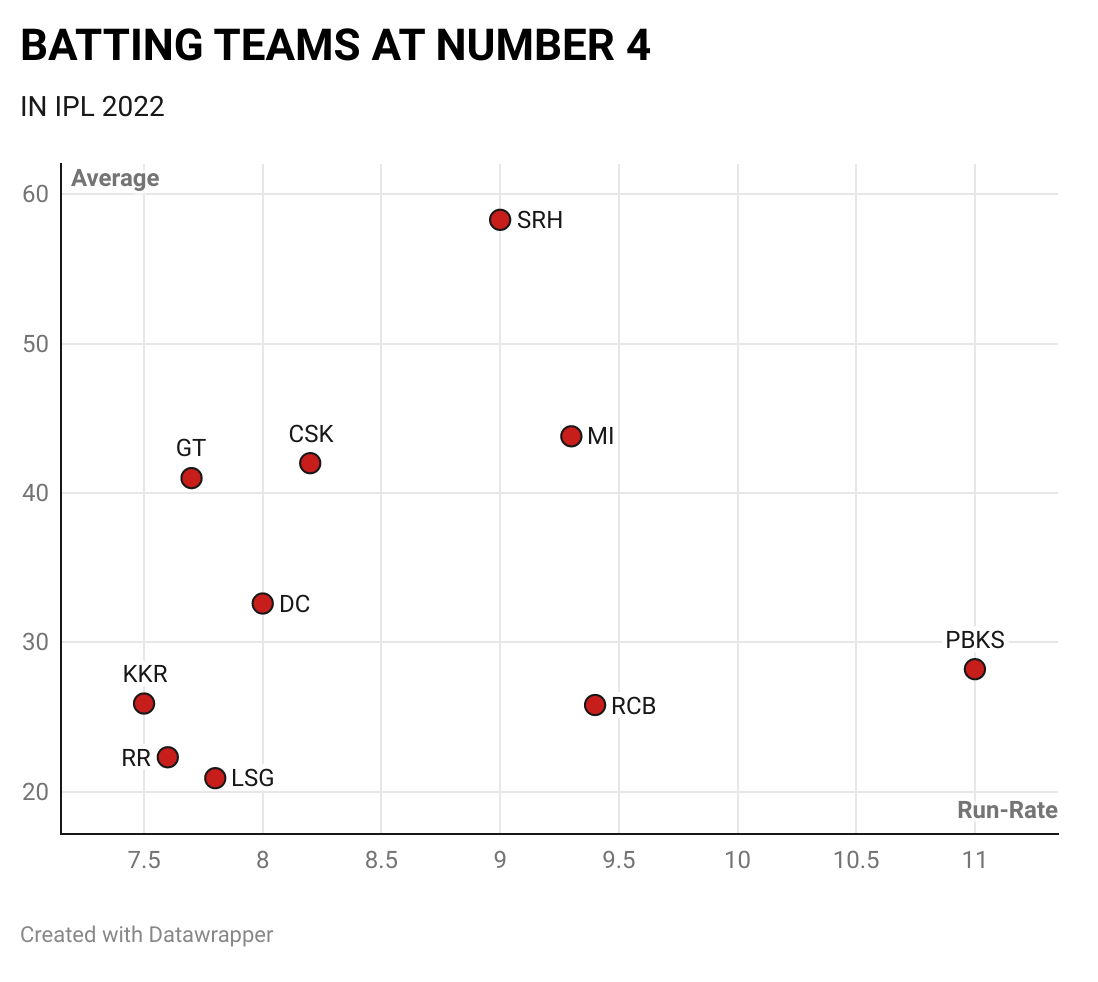 In IPL 2022 thus far, Rajasthan have the second-lowest average and strike-rate at number four. In their case, however, the underpar returns at number four are a reflection of the faults in their squad construction.