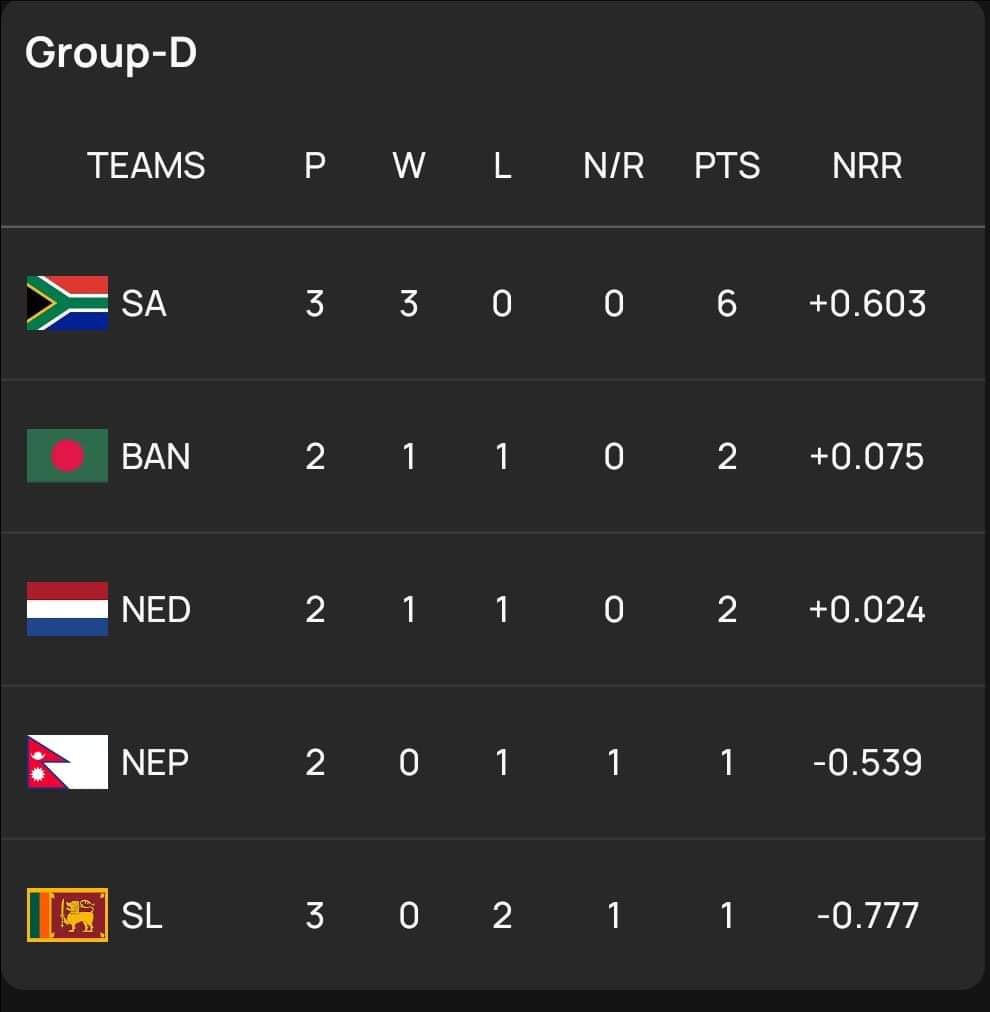Meanwhile, with the Sri Lanka-Nepal game washed out, South Africa become the first team to qualify for the Super Eights, having won all their three games so far. The tussle now will be between Bangladesh and the Netherlands and the winner of the duel on Thursday could very well determine which one of them would join the Proteas in the next round.