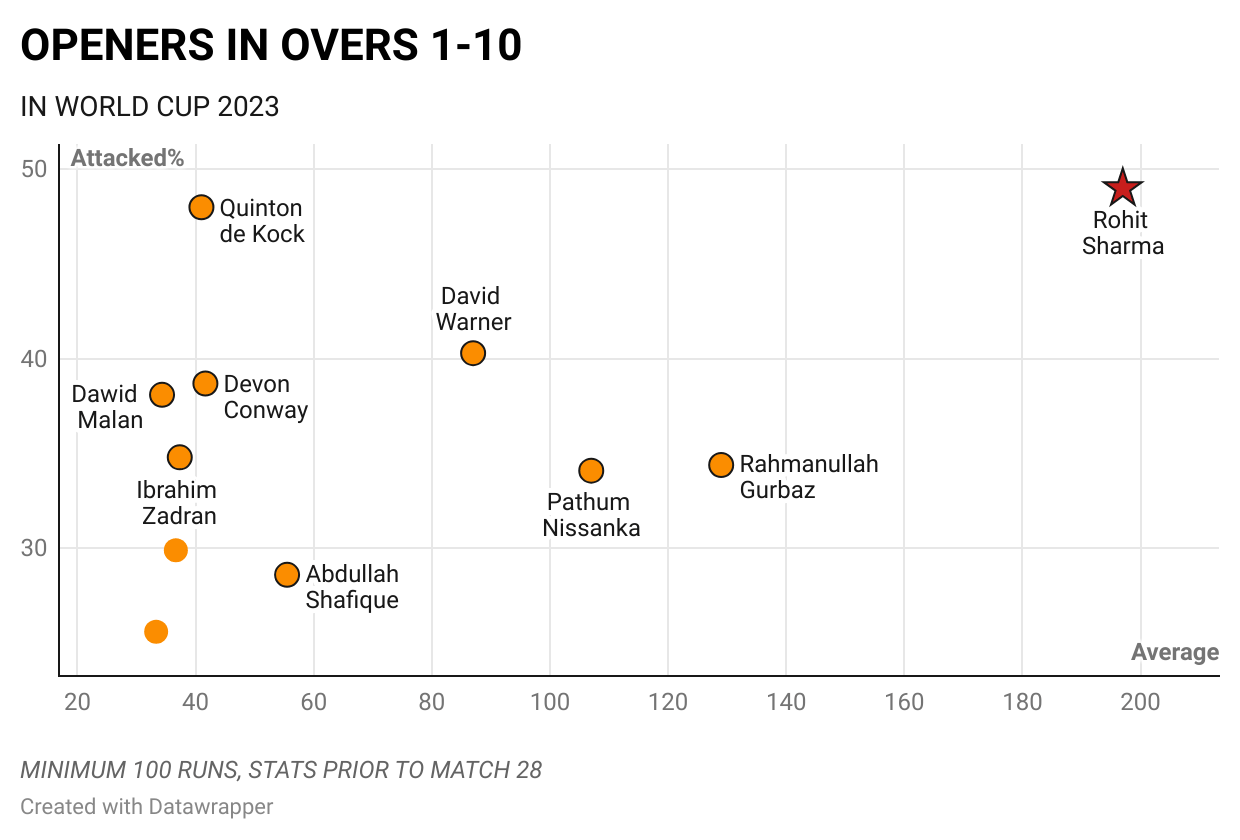 Averaging 65.2 at a run rate of 6.5, India have both second highest average and run-rate in the first 10 overs this World Cup. Rohit Sharma has scored 60.4% of India’s first powerplay runs. Among all openers this World Cup, Rohit has the third highest attacking shot percentage but it is an average of 197 that is scary.