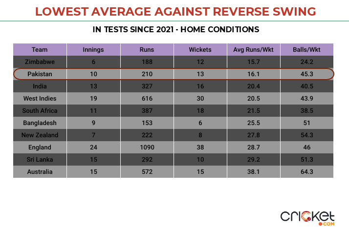 The result wasn’t produced just because of their intent, it was Pakistan batters' struggle against reverse swing that haunted them. It isn’t just about one Test. Since 2021, Pakistan batters have averaged 16.1 and have lost a wicket every 45.3 balls against reverse swing at home. Overall, they have lost a wicket every 21.7 runs and 49.7 balls. In the aforementioned time, only Zimbabwe have a poorer average (15.7) against reverse swing in home conditions.