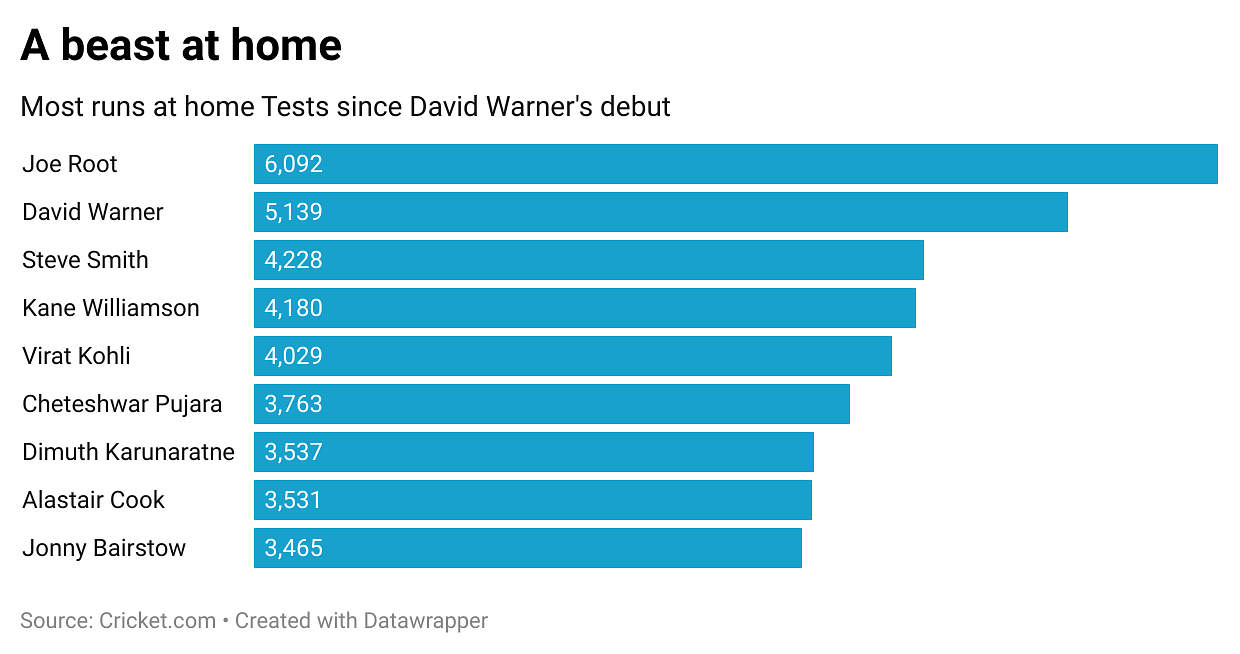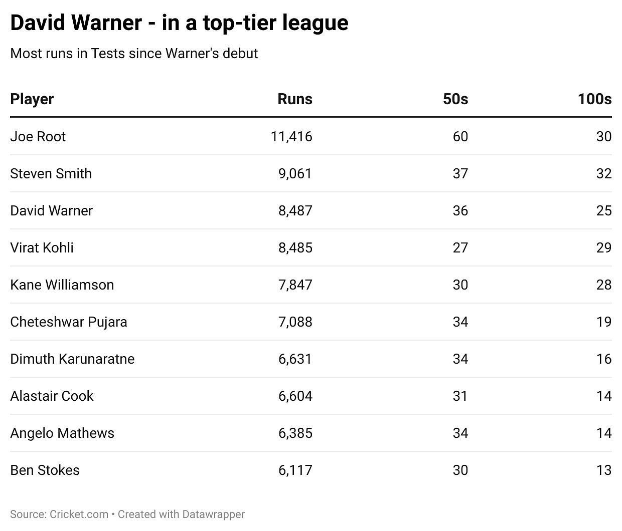 12 years later, since his debut, no opener in Test cricket, not even one of the red-ball greats, Sir Alastair Cook, has scored as many runs as Warner, with the gap being nearly 2000 runs. His average is the best for any Test opener (min 5000 runs since 2011), showing how he has been way above the others.