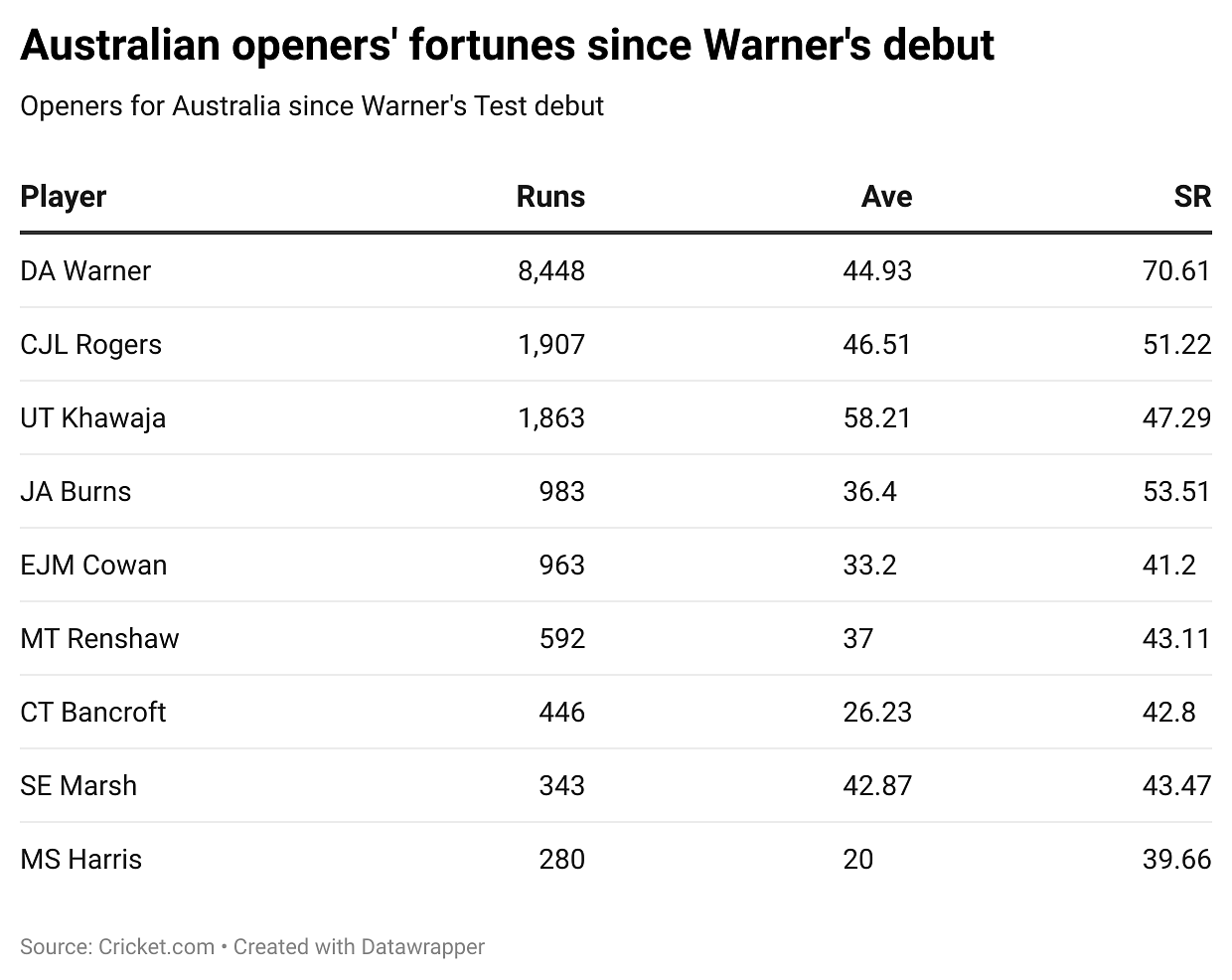 Four of the eight openers that have batted alongside Warner during his time as an opener have averaged over 40 (min 5 Tests). Usman Khawaja has been the biggest beneficiary of batting alongside an aggressive Warner, with 1863 runs at an average of 58.21.