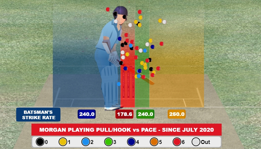 It also underlies in his treatment of the short ball. The left-hander averages only 17.1 against short or back of a length ball by pacers since July 2020. He is dismissed seven times. However, instead of a weakness, it highlights his attacking instincts. All the seven dismissals have come while playing the pull or the hook shot, where he averages 13.6. The below graphic is dominated by either singles, sixes or dismissals.