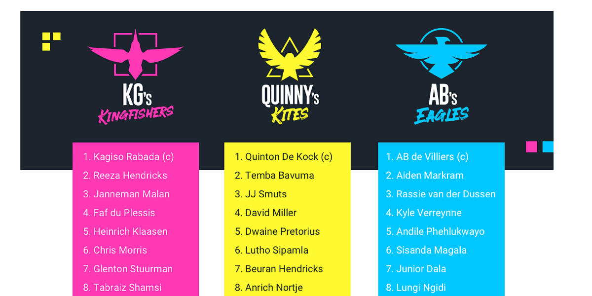 Quinny’s Kites: Quinton de Kock (c), David Miller, Temba Bavuma, Anrich Nortje, Dwayne Pretorius, Beuran Hendricks, JJ Smuts, Lutho Sipamla