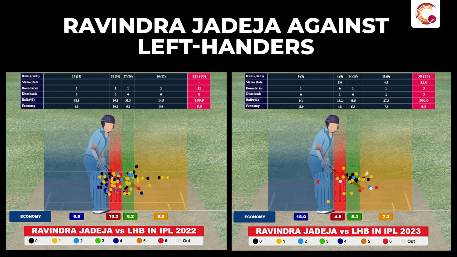 Jadeja’s bowling, however, has been quite good this season. The left-arm spinner has scalped six wickets in five innings at an economy of 7.1 and a strike rate of 17. What’s notable is his record against left-handers this season. Against them in IPL 2022, Jadeja had an economy of 8.2 and didn’t take a single wicket despite bowling 13.3 overs, but this year, he has managed three scalps in 5.3 overs at an economy of 6.9. And he has been able to do that because he has hardly bowled the stump line.