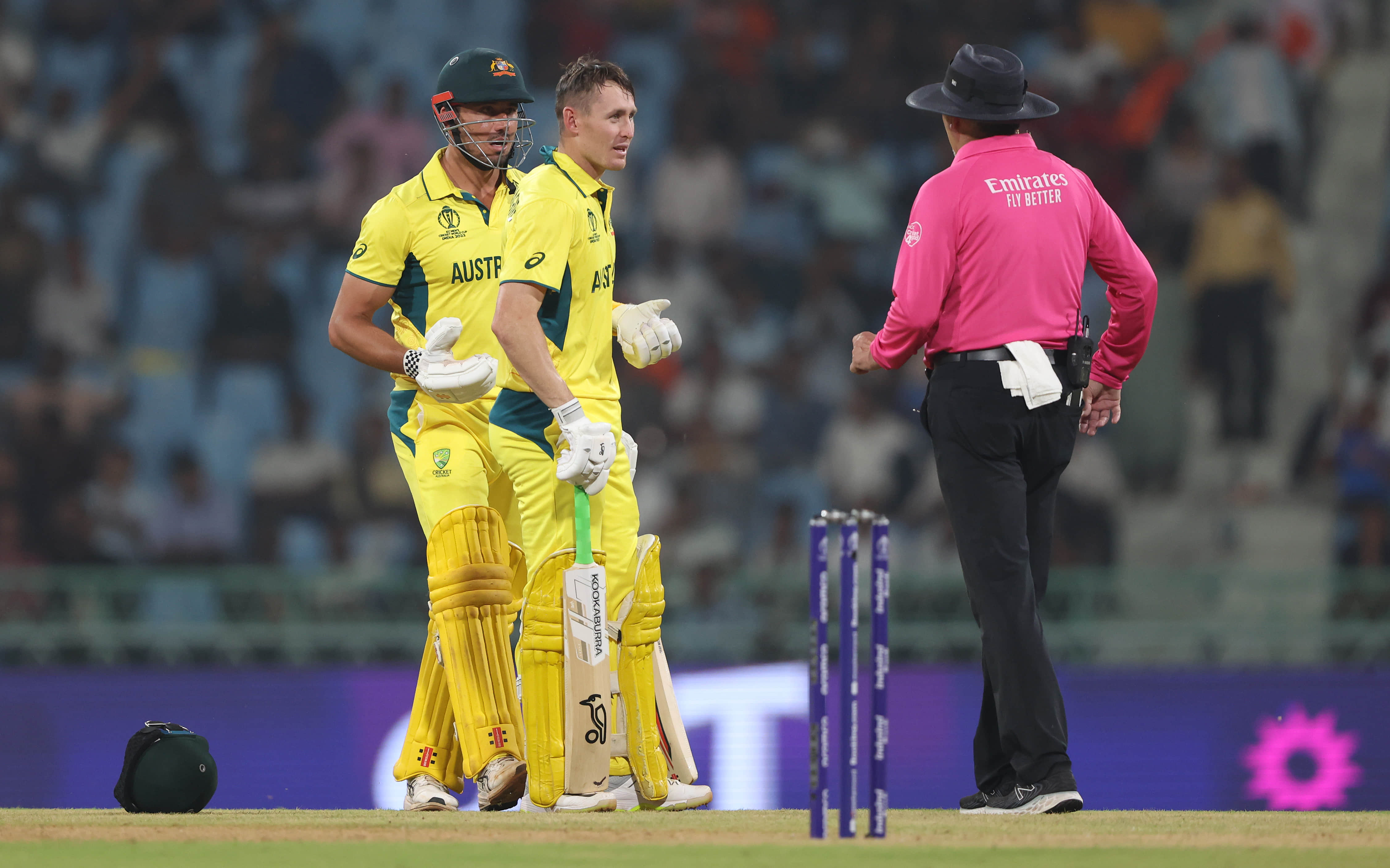 After several replays, TV umpire Richard Kettleborough thought Stoinis' right glove was still in contact with the bat when the ball grazed. However, the replays were inconclusive to rule against the on-field decision.