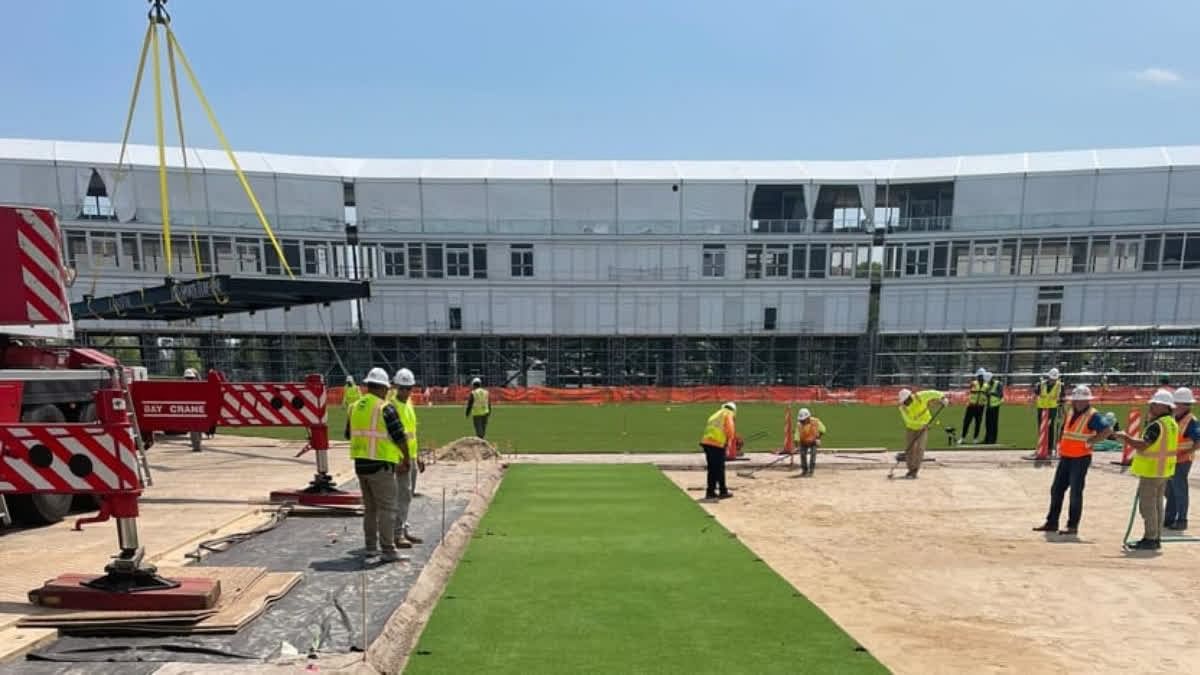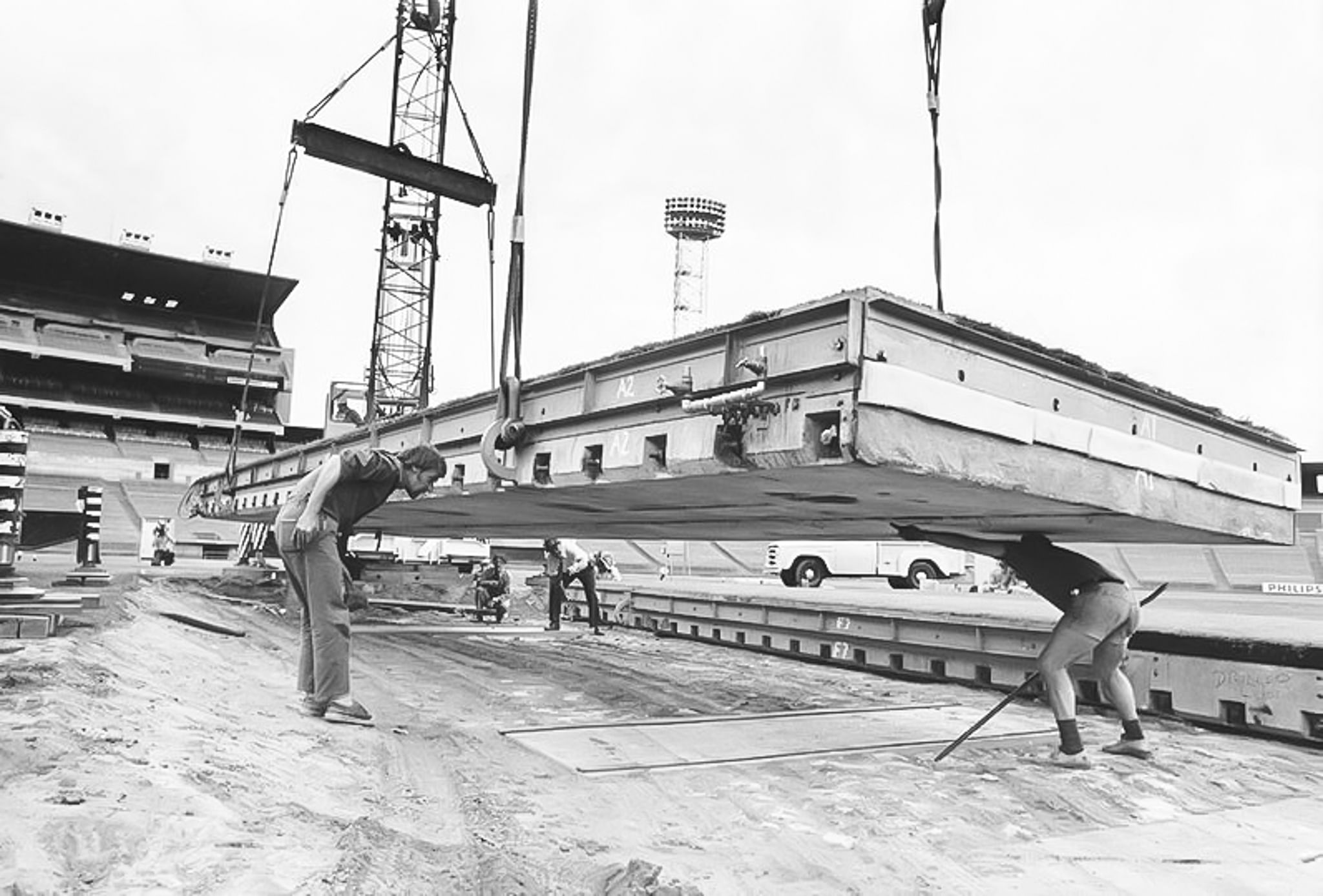 He grew the pitches indoors in greenhouses (which allowed him climate control), using perforated trays to facilitate the growth of Couch grass (also called Bermuda Grass), which covers the top surface of the pitch. Then, the pitch trays were lifted from the greenhouse and transported to the ground using a truck.