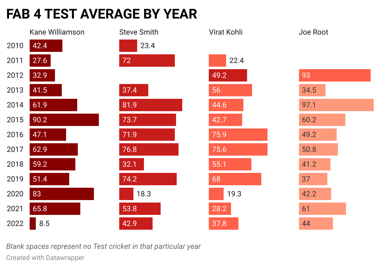 Post-2014, in none of the other eight years, Root averaged less than 35. Apart from the ongoing year 2022, the same goes for Williamson. In fact, in none of the years, Williamson’s average dropped below 45.