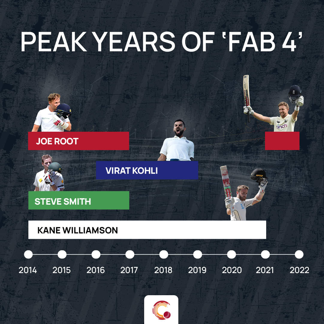It was the year 2014 in which all these four batters started to score consistently and a notion of the Fab-four began to surface. At the end of 2014, Root had an average of 97.1 in 11 innings, Smith averaged 81.9 in 17 innings, Williamson averaged 61.9 in 17 innings and Kohli had averaged 44.6 in 20 innings in that calendar year.