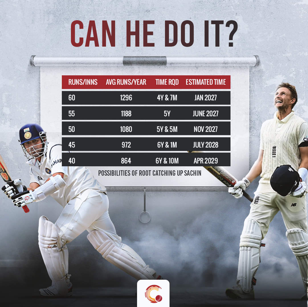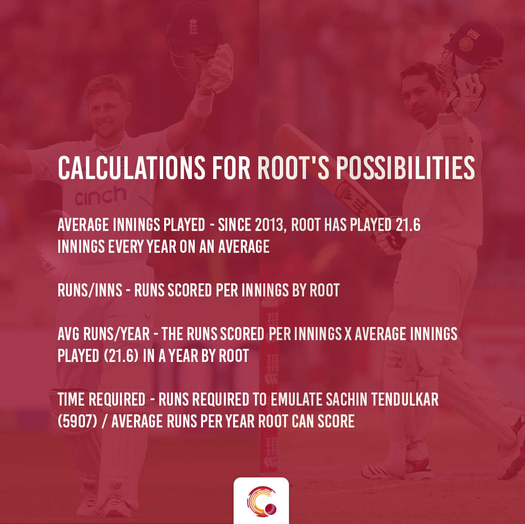 Root is currently 5907 runs behind Sachin’s tally of 15921. On average, barring his two innings in 2012, Root has played close to 22 (21.6) innings every year since 2013. If Root continues to score 50 runs per innings consistently, he has the chance of scoring approximately 1080 runs per year.