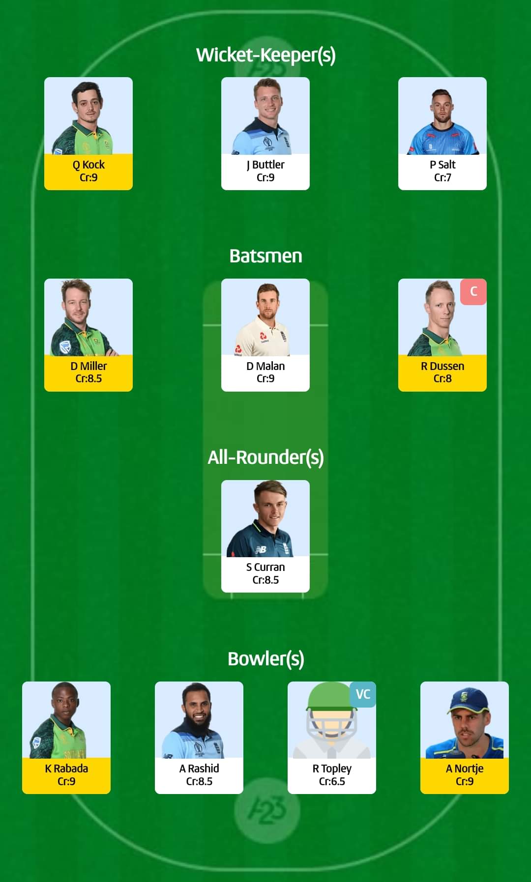 For small leagues: Rassie van der Dussen (capt), Reece Topley (vice-capt)