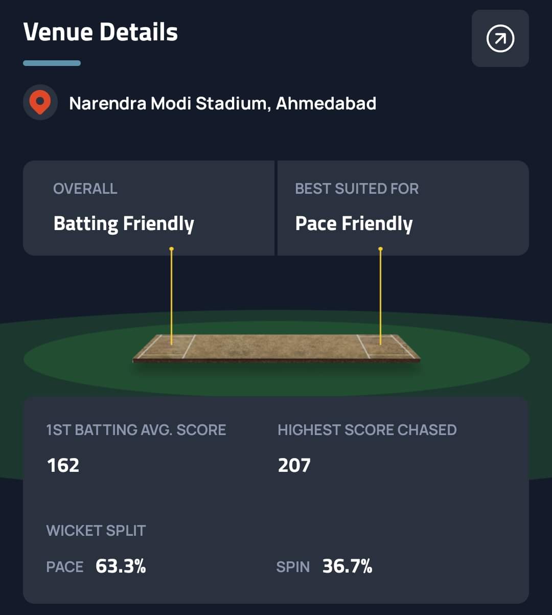 The Narendra Modi Stadium has hosted two encounters so far this season and the batters here have scored runs at an average of 33.5 and a scoring rate of 9.7, while a wicket has fallen every 20.7 deliveries. In the bowling department, the spinners (average 21.8, SR 15.6, economy 8.4) have better numbers than seamers (average 41.1, SR 24.6, economy 10).