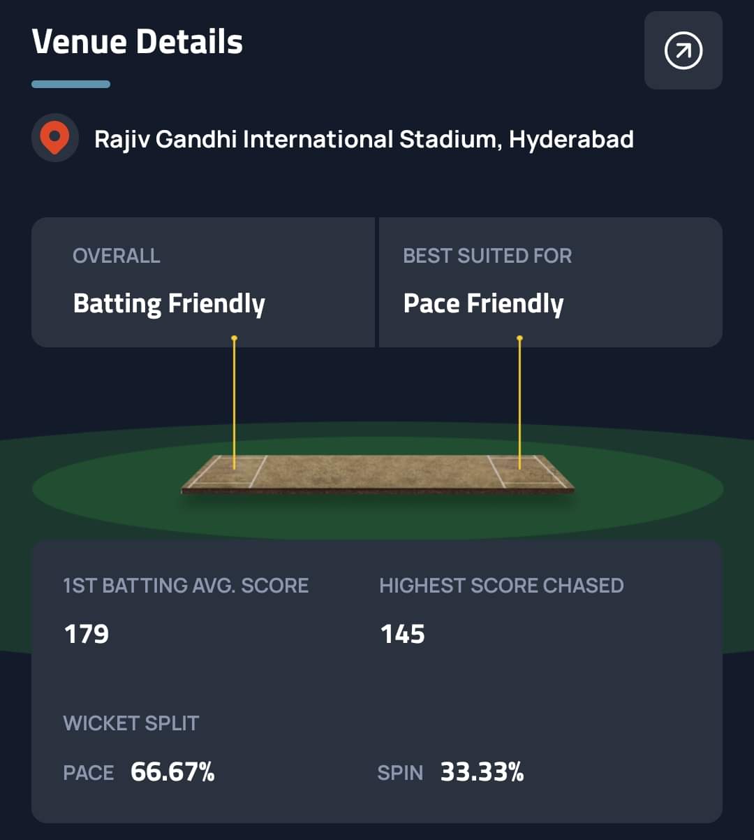 The Rajiv Gandhi International Stadium has hosted three matches this season and batters here have scored runs at an average of 25.4 and a scoring rate of 8.4, while a wicket has fallen every 18 deliveries. This is one of those rare Indian venues with bigger boundaries. The seamers (average 26.8, SR 19, ER 8.5) here have slightly better numbers than spinners (average 28, SR 20.6, ER 8.2).
