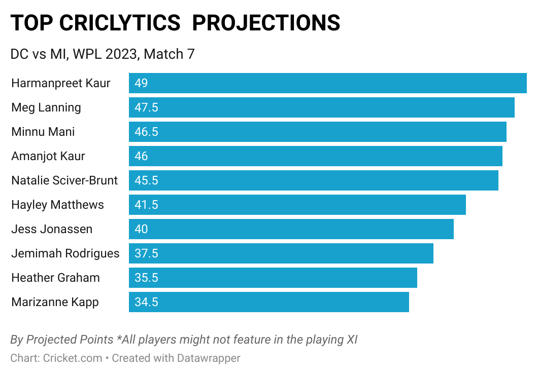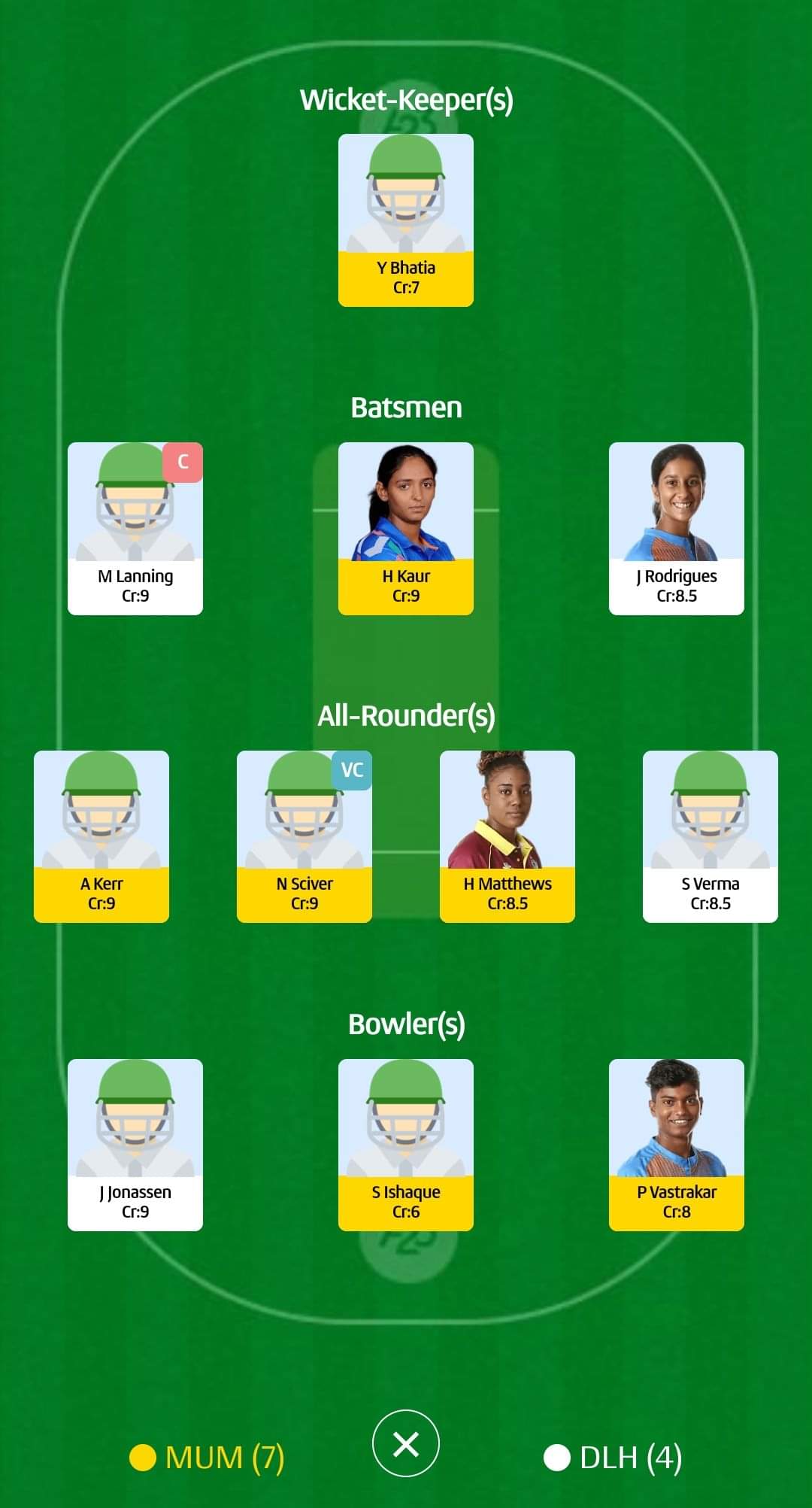 Mumbai Indians: Hayley Matthews, Yastika Bhatia (wk), Nat Sciver-Brunt, Harmanpreet Kaur ( c ), Amelia Kerr, Amanjot Kaur, Pooja Vastrakar, Issy Wong, Saika Ishaque, Humaira Kazi, Jintimani Kalita