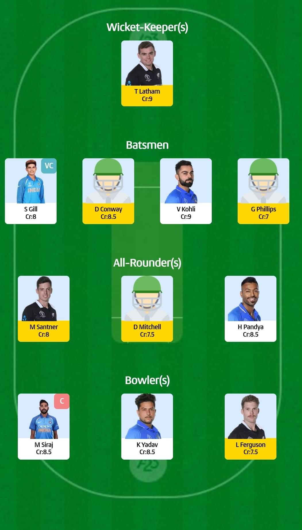 For grand leagues: Virat Kohli ( c ), Tom Latham (vc)